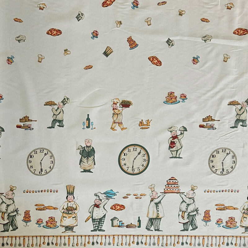 La tela de algodón para mantelería en color blanco roto, decorada con simpáticos cocineros, relojes y utensilios de cocina, es una opción encantadora y funcional para dar un aire alegre y acogedor a tu hogar. Su ancho de 1,50 metros la convierte en una elección versátil para confeccionar manteles de diferentes tamaños, caminos de mesa o incluso proyectos decorativos. El diseño incluye una cenefa de utensilios en los bordes que enmarca la tela con un toque distintivo y divertido, perfecto para resaltar la mesa en reuniones familiares o celebraciones especiales.