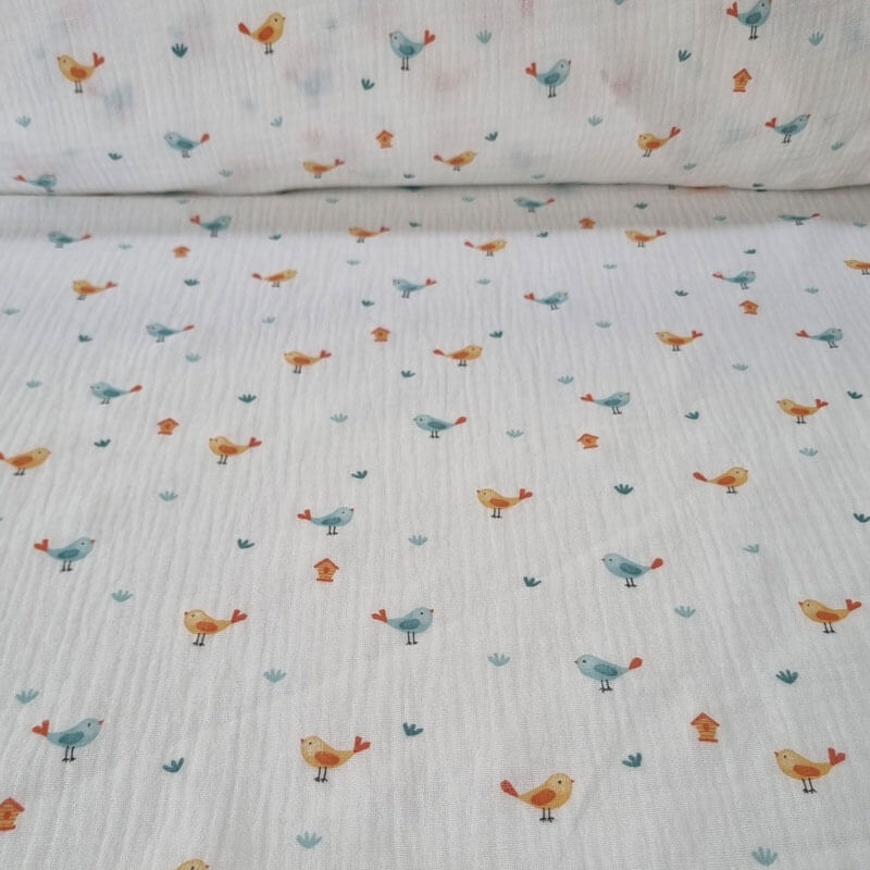 La Tela de Doble Gasa Bambula Blanca Pájaros es un tejido ligero y transpirable con un estampado encantador de pajaritos en tonos naranjas y celestes sobre un fondo blanco. Su textura suave y esponjosa la hace perfecta para confeccionar prendas cómodas y frescas.