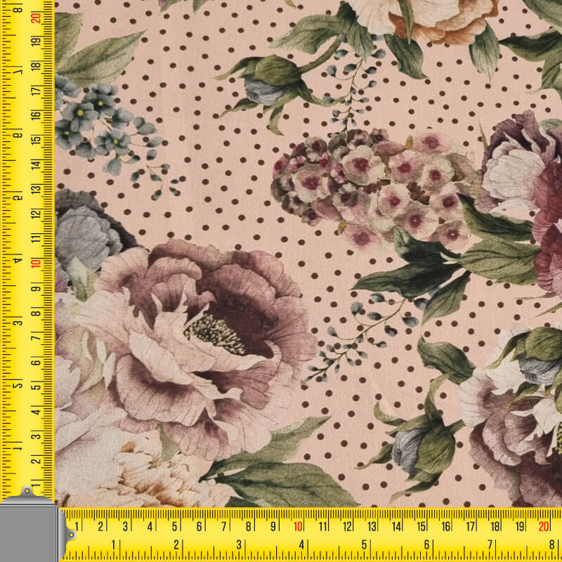 La Tela de Popelín Algodón Maquillaje Flores y Lunares combina un fondo en tono maquillaje con un encantador estampado de lunares blancos y flores en tonos suaves y delicados. Su diseño elegante la hace ideal para confecciones femeninas y sofisticadas.