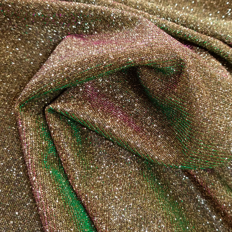 La base de punto dorado proporciona una textura suave y elástica, ideal para la creación de prendas que desean fusionar comodidad con un toque de lujo. La purpurina añade un brillo sutil, y el efecto tornasolado en verde y lila crea una dinámica visual fascinante. Esta combinación de elementos resulta en una estética única que evoca la sofisticación y la originalidad.