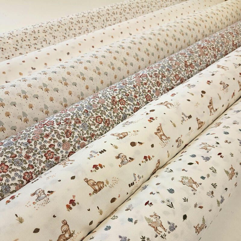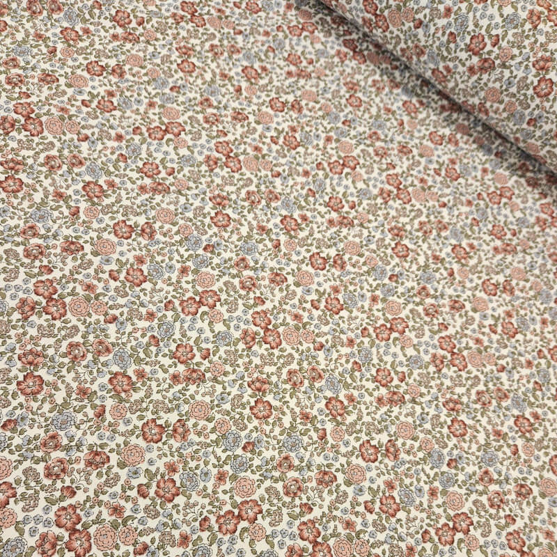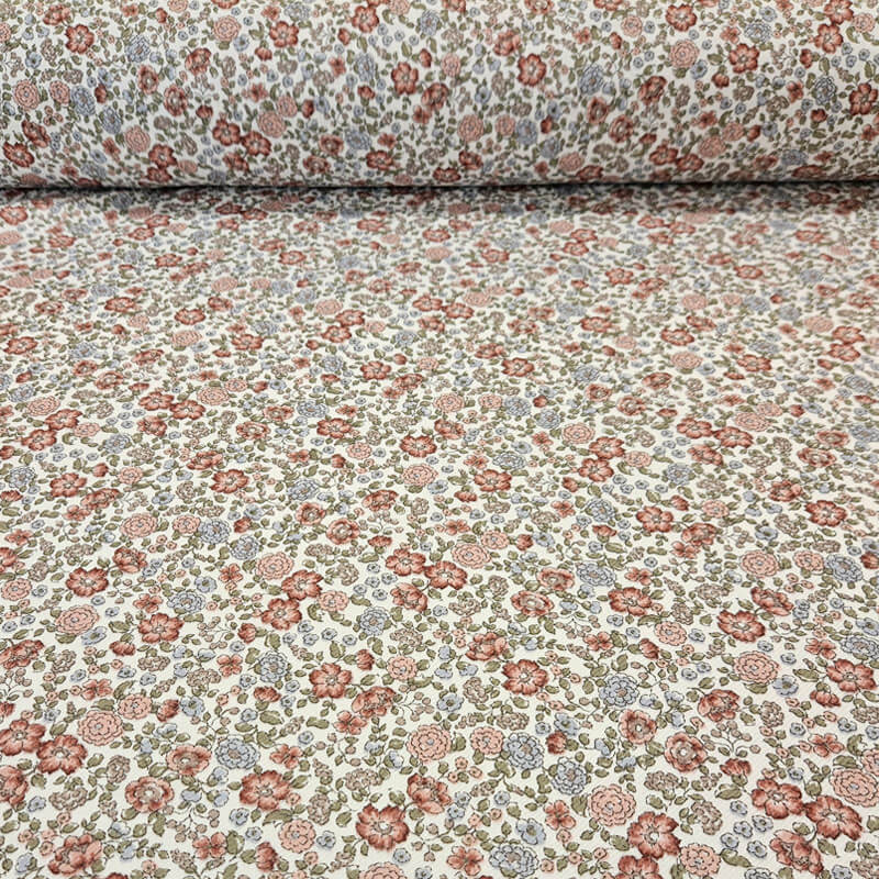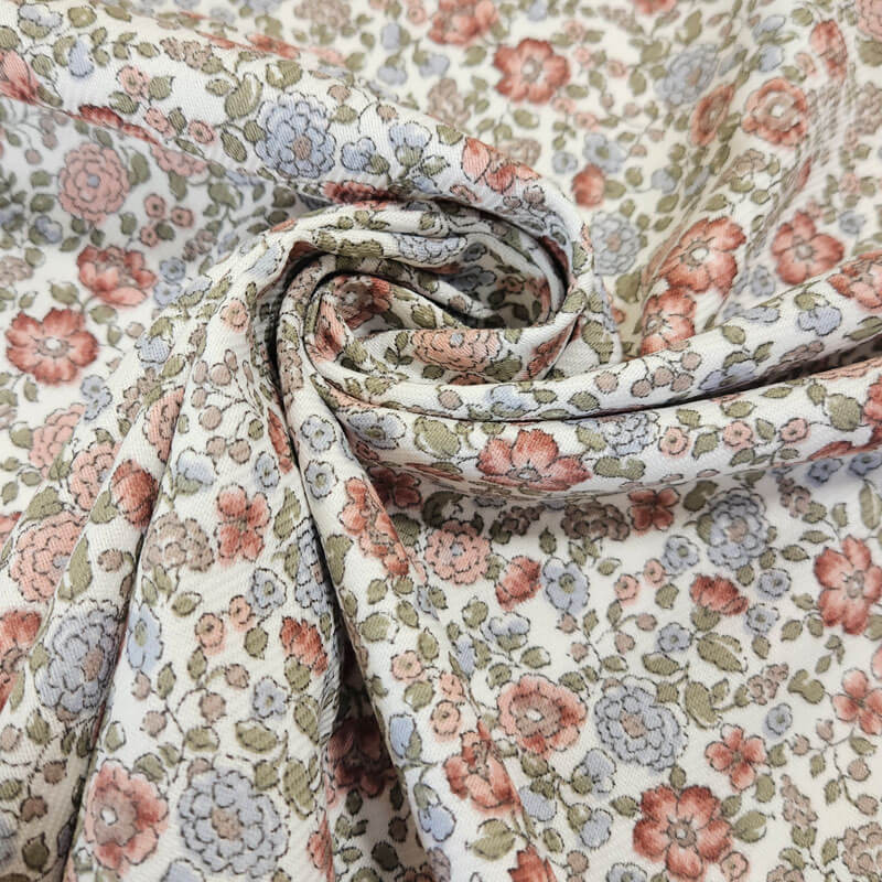 Esta tela de sarga 100% algodón luce un fondo blanco roto salpicado por un jardín de flores menudas en tonos teja y azul azafata, acompañadas de hojas verde oliva. El dibujo, de inspiración clásica, resulta delicado y equilibrado, ideal para quienes buscan un estampado infantil con aire romántico pero fácil de combinar. La trama en sarga aporta cuerpo y caída controlada, ofreciendo una superficie suave y resistente que facilita la confección y soporta el uso cotidiano sin perder presencia.