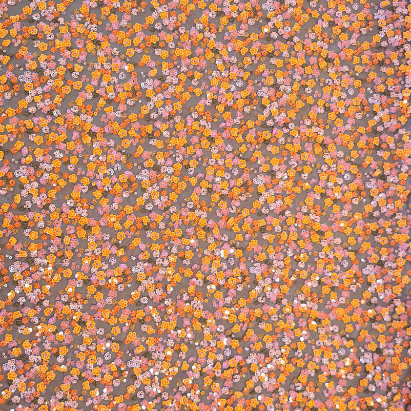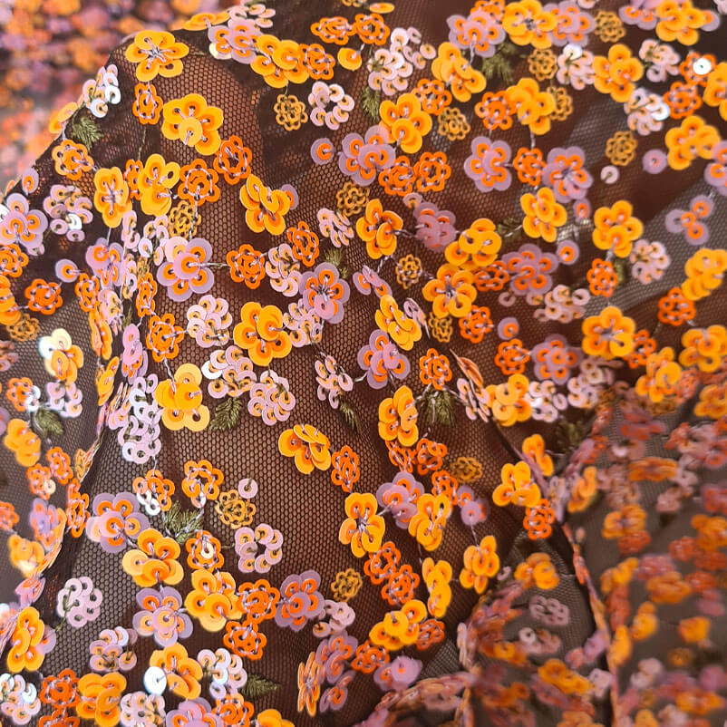 Compra al mejor precio Tela de Tul con Lentejuelas en forma de Flores Malvas y Mostazas (ancho 1,25M)