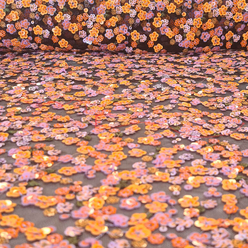 Descubre nuestra impresionante tela de tul negra con deslumbrantes lentejuelas en forma de flores en tonalidades malva, mostaza y naranja. Con un ancho de 1,25 metros, esta tela te brinda la oportunidad de crear prendas y accesorios únicos llenos de estilo y sofisticación.