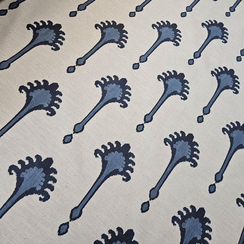 La Tela de loneta Half Panamá Beige Motivo Imperial Azul Lino Algodón (ancho 2,80M) destaca por su diseño geométrico y refinado que evoca la elegancia de los antiguos tejidos imperiales. Sobre un fondo beige natural se repite un patrón de figuras alargadas en azul marino y azul grisáceo, dispuestas con ritmo y armonía. Este contraste sobrio y sofisticado aporta un toque clásico, ideal para ambientes que buscan equilibrio entre tradición y modernidad. Su textura de medio grosor y su composición natural realzan su aspecto artesanal y atemporal.